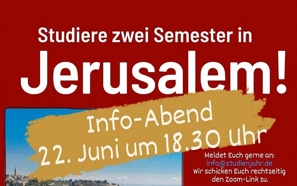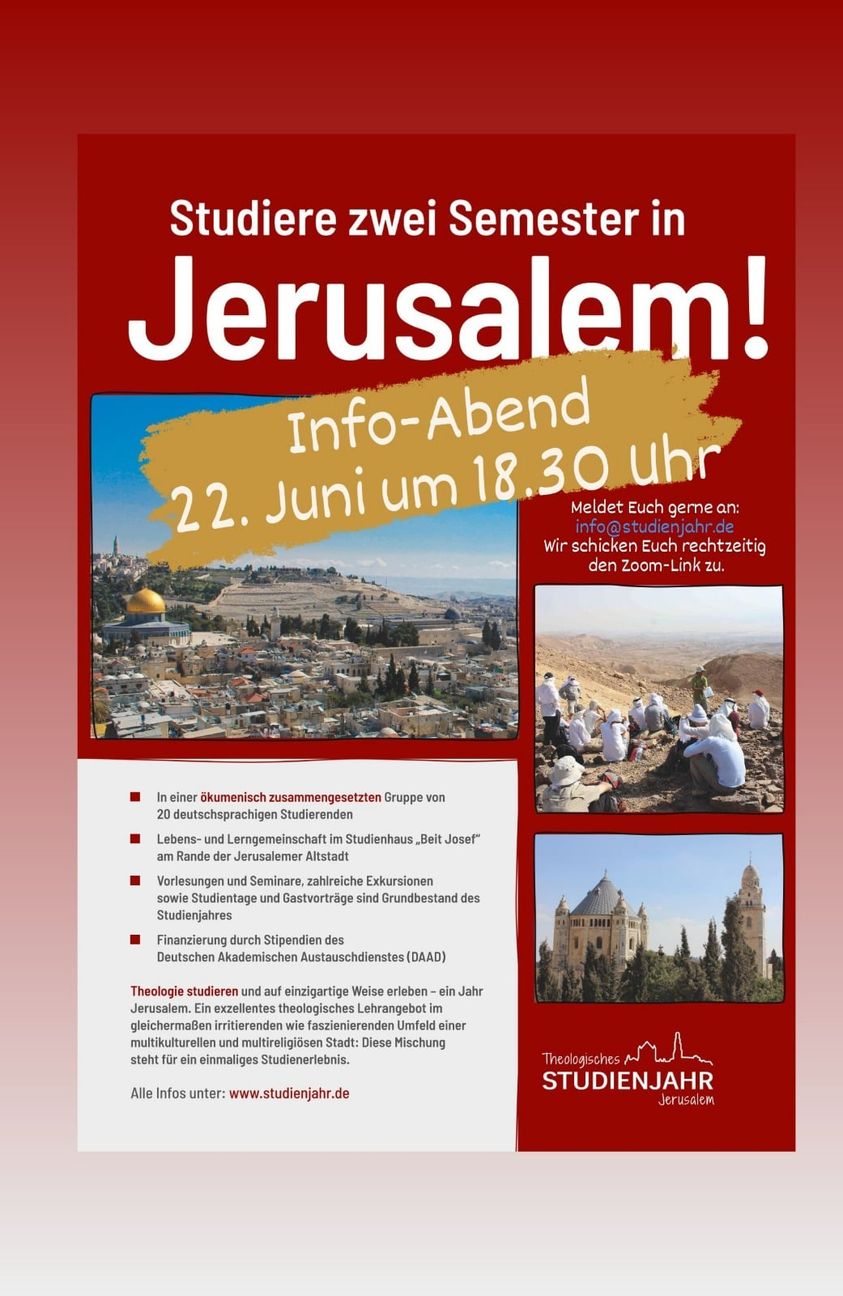 Wir haben Ihr Interesse geweckt? Dann lernen Sie das Theologische Studienjahr Jerusalem kennen und kommen Sie zur digitalen Info-Veranstaltung mit ehemaligen Studienjährler*innen und der Studiendekanin der Kath.-Theol. Fakultät Innsbruck am Dienstag, 22. Juni, um 18:30 auf Zoom. Melden Sie sich an unter info(at)studienjahr.de und erhalten Sie den Zugangslink. Wir freuen uns auf Sie!